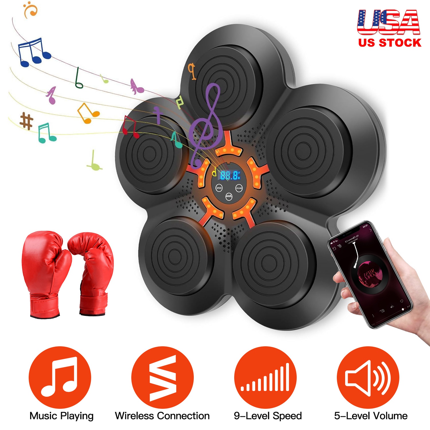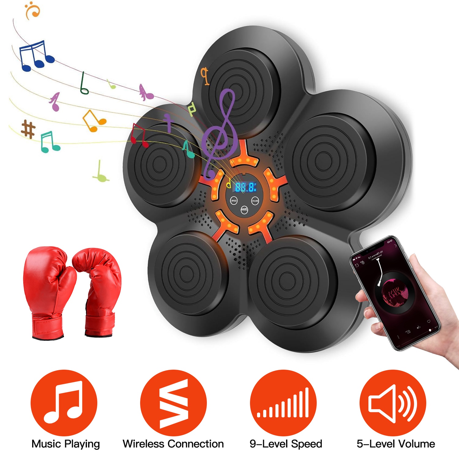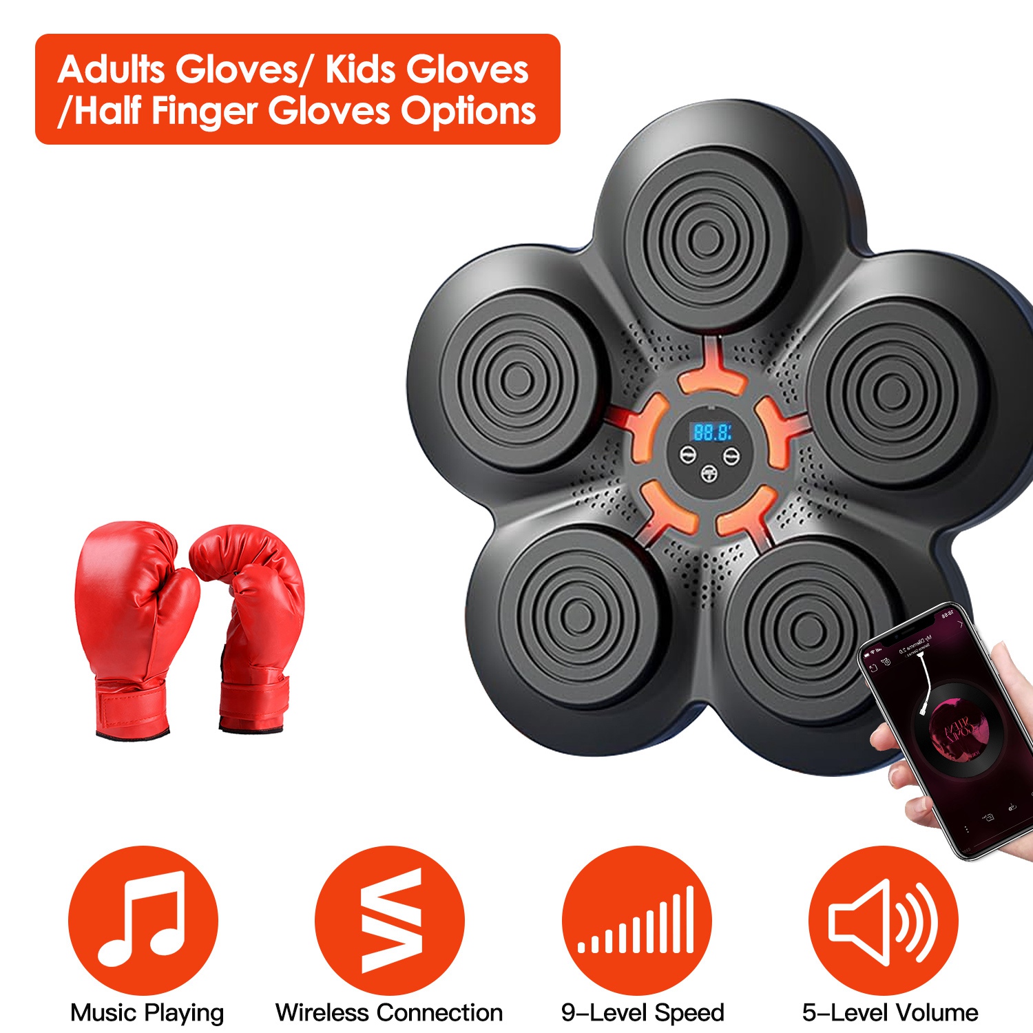 It's a portable compact but efficient and fun boxing equipment. Designed with jumping red light to improve your reaction speed, endurance, or help you keep fit or lose weight. You can adjust 9 levels of speeds, suitable for both novices and boxers, both kids and adults. Wireless connecting mode allows you to play the music you like while boxing, greatly enhancing your experience and having more fun. Just stick the hook&loop strip on the wall and paste the machine, then you can enjoy the boxing fun. We also provide you with a pair of gloves for using. Adults/Kids/Half Finger Gloves can be chosen according to your needs.
