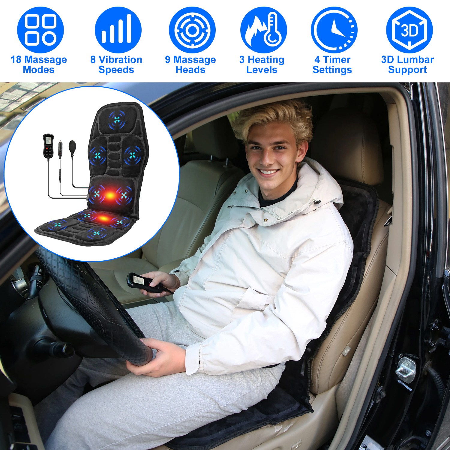 Designed with 18 massage modes, 4 pinpoint massage modes, 8 vibration speeds and 3 heating levels, our massage chair pad offers customizable relaxation for the neck, back, waist, hip and thigh. The adjustable 3D lumbar traction design not only provides strong support and stabilization for the lower back, but also helps maintain proper posture and the natural curve of your spine. With the included adapter cable and the cigarette cable, you can use it at home, in the office and car. Support over-current protection. Enjoy a safe and comfortable massage after a busy day. A thoughtful gift for your mother, father, lovers and colleagues!