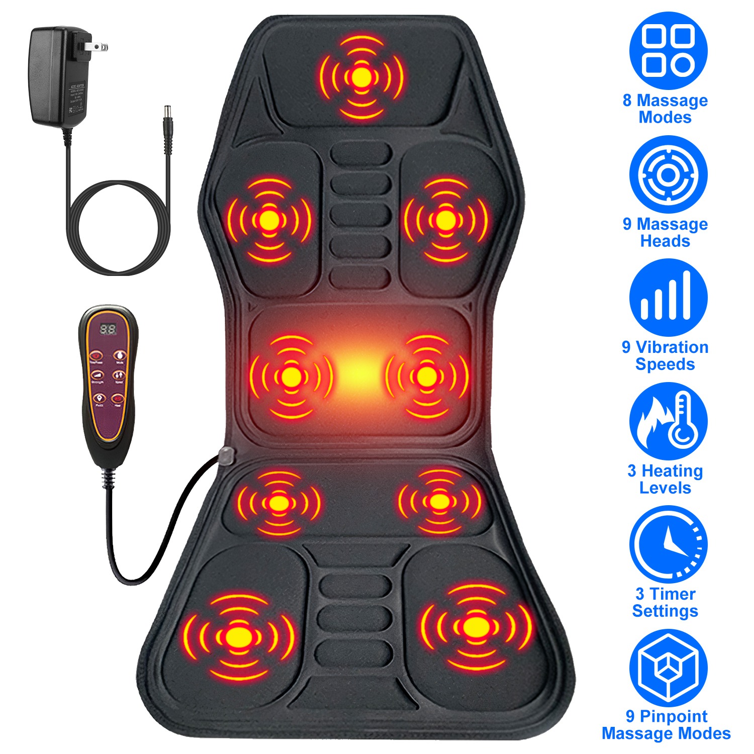 Designed with 8 massage modes, 9 pinpoint massage modes, 9 intensity levels, 9 speeds, 3 heating levels and 3 timer settings, our massage chair pad offers customizable relaxation for the neck, back, waist, hip, thigh and calf. With the included adapter cable and the cigarette cable, you can use it at home, in the office and car. Support over-current protection. Enjoy a safe and comfortable massage after a busy day. A thoughtful gift for your mother, father, lovers and colleagues!