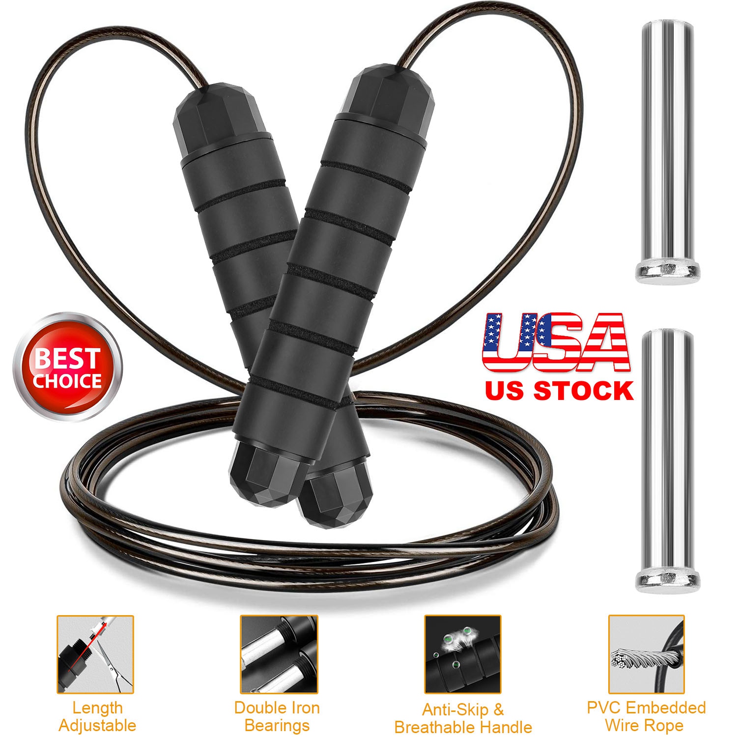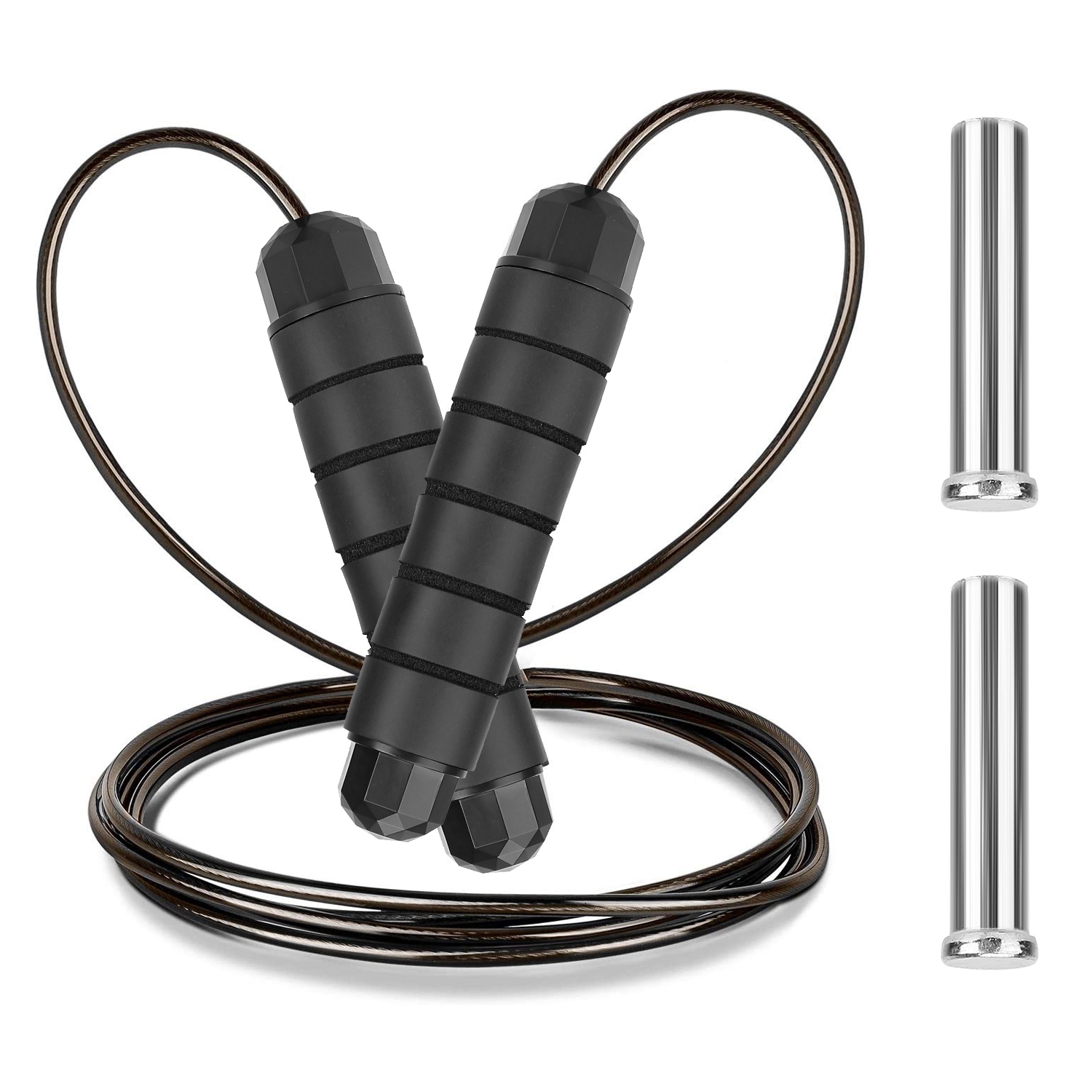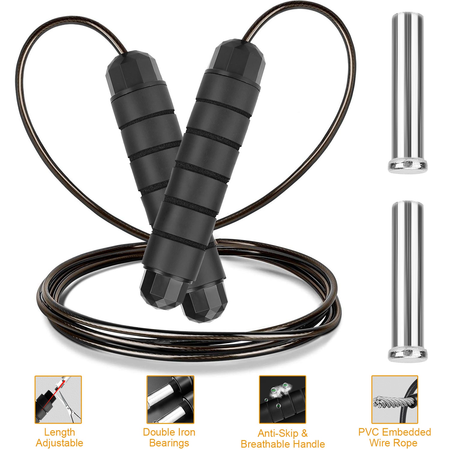 Made of sturdy PVC embedded wire rope, and anti-skip foam handle, our Jumping Rope can last a long service life and provides extra comfortable and strong grip. Come with 9.84ft rope, it can be adjusted and cut easily to fit for your height. You can also add the extra iron bearings to exercise.