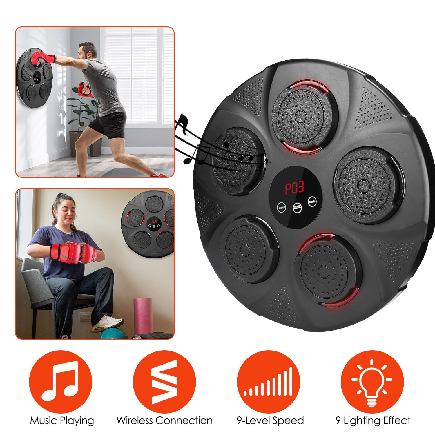 It's a portable compact but efficient and fun boxing equipment. Designed with 9 modes of jumping red light to improve your reaction speed, endurance, or help you keep fit or lose weight. You can adjust 9 levels of speeds, suitable for both novices and boxers, both kids and adults. Wireless connecting mode allows you to play the music you like while boxing, greatly enhancing your experience and having more fun. Just stick the hook&loop strip on the wall and paste the machine, then you can enjoy the boxing fun. We also provide you with a pair of gloves for using. Adults/Kids/Half Finger Gloves can be chosen according to your needs.