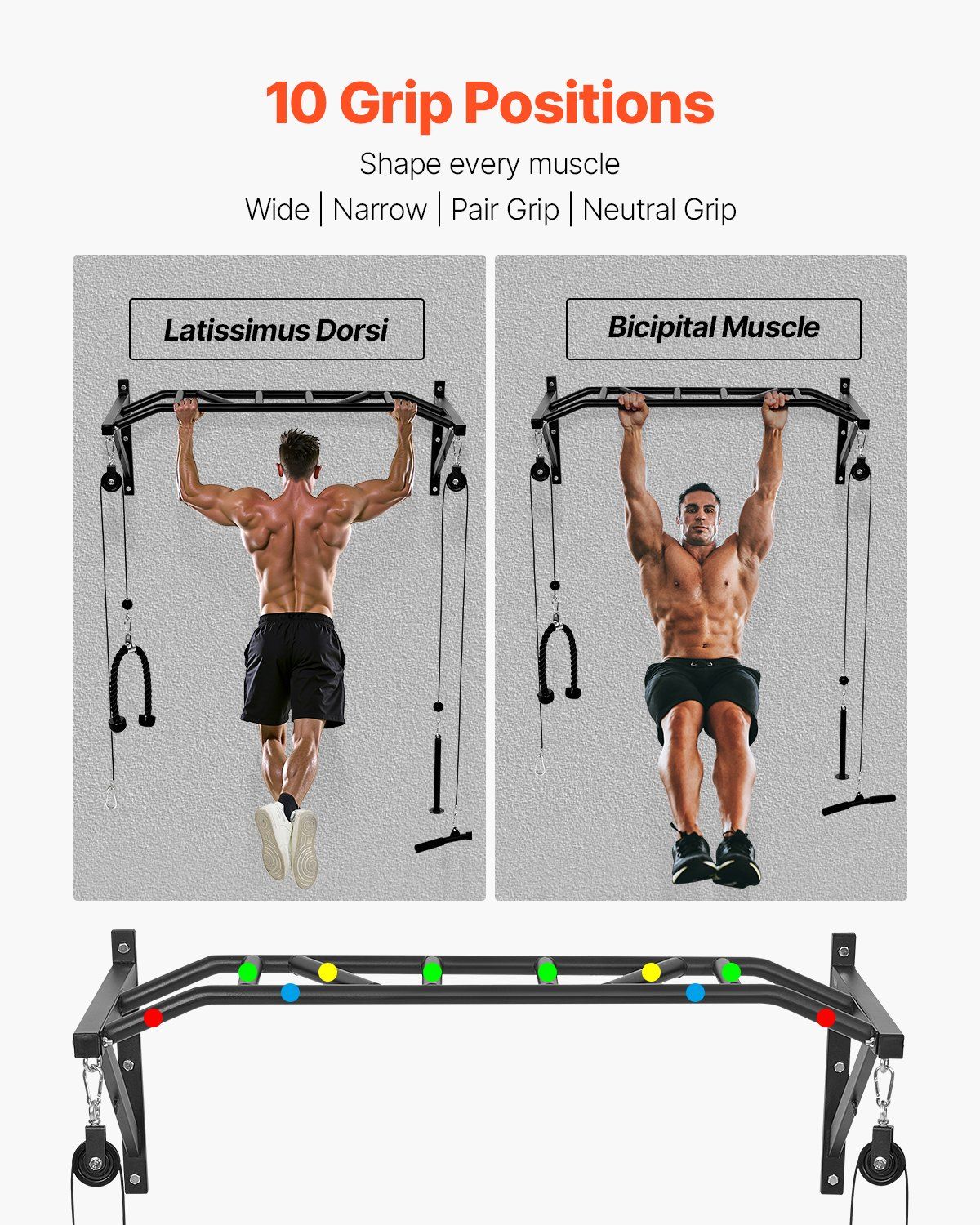 2.10 Professional Grip Positions: By adjusting wide, narrow, and neutral grips, you can target your back, arms, and core muscles with precision. This wall mounted chin up workout training station allows you to train every inch of your muscles, easily achieving your perfect physique